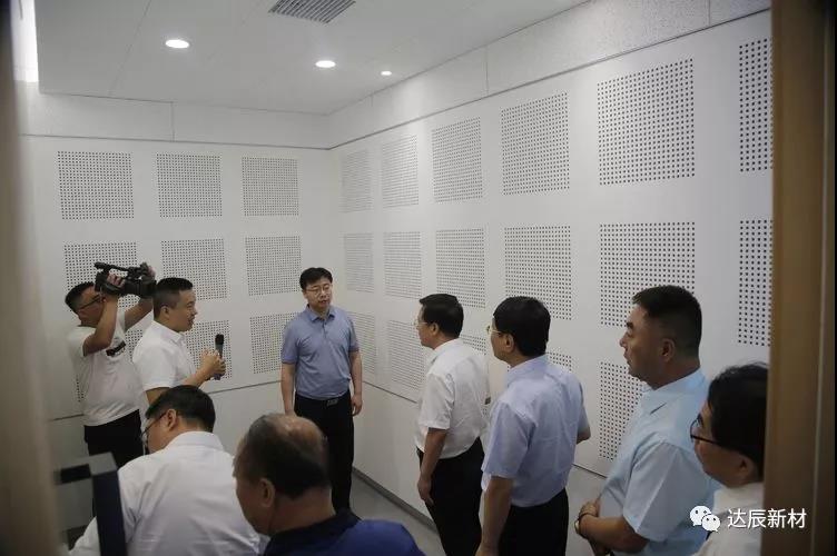 達(dá)辰展廳作為領(lǐng)導(dǎo)一行參觀的第一站,達(dá)辰新材總經(jīng)理王曉親自擔(dān)任講解,領(lǐng)導(dǎo)們了解了達(dá)辰各式建材產(chǎn)品與發(fā)展前景。當(dāng)今隨著全面建成小康社會以來,在新時代新發(fā)展下人民經(jīng)濟(jì)生活水平不斷提高,人們在家居裝飾的需求已不在單一局限于家居外觀裝飾,而是更加青睞于具備功能性、便捷性、環(huán)保性的綠色建材產(chǎn)品。為順應(yīng)時代新發(fā)展趨勢,達(dá)辰新材公司以可持續(xù)發(fā)展與創(chuàng)新作為戰(zhàn)略方向,研發(fā)出了達(dá)辰品牌紙面石膏板、礦棉吸聲板、輕鋼龍骨等系列產(chǎn)品?!斑@面是達(dá)辰紙面石膏板系統(tǒng)墻,上面覆有三種顏色,象牙色為標(biāo)準(zhǔn)板,紅色為耐火板,適用于防火需求較高的場所。綠色為耐水板,適用于相對濕度較大的空間。紙面石膏板可在裝飾中起到輕質(zhì)、隔聲、隔熱的作用,且施工簡便。根據(jù)石膏板功能的不同,可以運(yùn)用于不同需求的場所,互相搭配使用?!痹谕蹩偨?jīng)理細(xì)致的講解下,領(lǐng)導(dǎo)們跟隨移步,認(rèn)真聆聽?!斑@是礦棉吸聲板隔墻,礦棉吸聲板廣泛適用于辦公、教育、文化娛樂、運(yùn)動、酒店等各種場所,具有綠色環(huán)保、吸聲降噪、保溫節(jié)能、輕質(zhì)易裝等優(yōu)能?!彪S后在達(dá)辰測驗(yàn)墻面承重展示與聲學(xué)體驗(yàn)室,領(lǐng)導(dǎo)一行在身臨其境中對達(dá)辰產(chǎn)品承重力與防聲優(yōu)能給予了贊賞。
